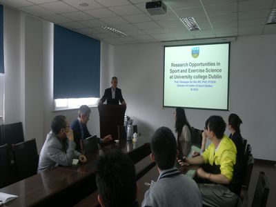 4月23日上午,在运动科学学院四楼会议室,来自爱尔兰都柏林大学体育研究中心的两位教授正在这里举办博士招生推介会。运动科学学院党总支书记刘宏,辅导员王慧敏、国际文化交流中心留学生部的钮老师,以及感兴趣的研究生参加了此次推介会。
