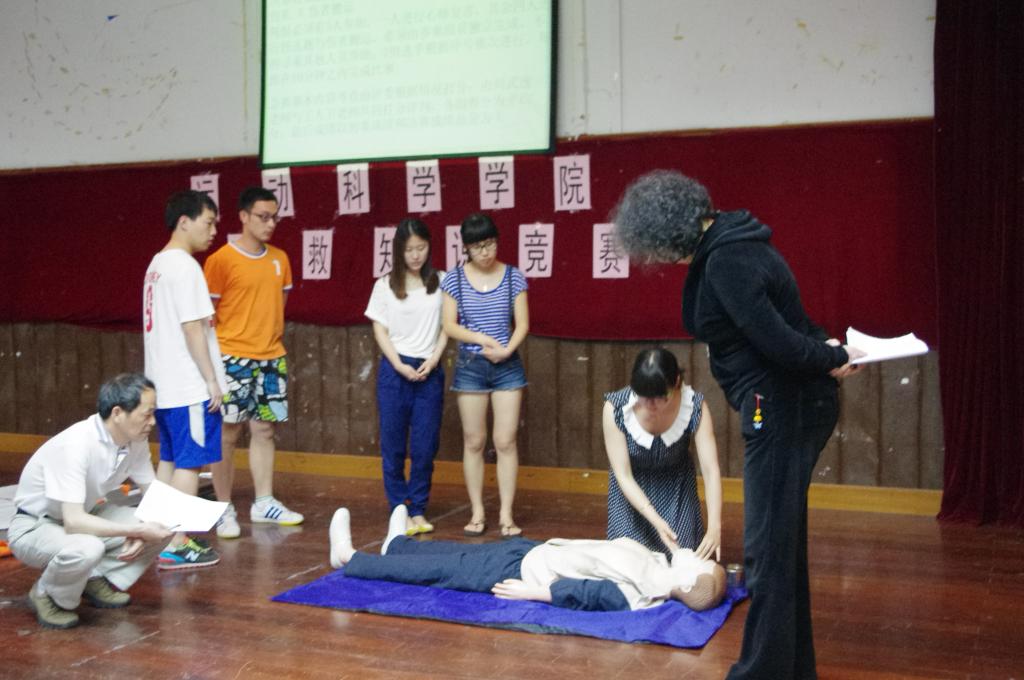 5月21日晚上7点,运动科学学院学生分会举办的急救知识竞赛决赛急救演练在活动中心三楼舞厅拉开帷幕。出席本次比赛的嘉宾有运动科学学院副院长王茹老师,运动科学学院团总支书记陈莉莉老师,担任本次比赛评委的是运动科学学院王人卫老师和刘无逸老师。本次比赛意在通过实践演练,加深运科学子对于专业知识的理解,使第一课堂与第二课堂相结合。