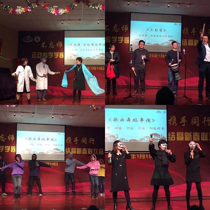 总结表彰仪式结束,进入新春联欢。伴随着欢快的音乐,由运科学院运动生化与营养团队带来的《民族舞之管住嘴迈开腿》,拉开了本次联欢会的序幕,寓意运科学院新的一年,新的征程。运动生物力学团队的表演《三句半》将本次联欢会的气氛拉向高潮,运动康复团队带来的健身操《运动康复麻辣烫》,重在表达运动健身,重在科学,贵在坚持,最后,由60后、70后、80后、90后代表带来的《歌曲舞蹈串烧》,寓意运科精神代代相传,永垂不朽。新春联欢会由青年教师傅维杰、于清华主持。