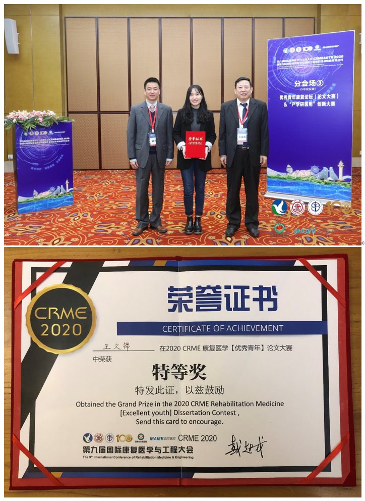 此会议在全国征文,包括生物力学与步态分析、虚拟现实增强现实康复技术、电生理信号检测与分析、可穿戴传感器与刺激康复系统和运动检测与分析等领域范围,最终入选13篇优秀论文进入决赛,运动科学学院王文锦获得了唯一的特等奖,为学校学院争光!大会主席王金武教授和谢叻教授为王文锦颁发特等奖荣誉证书。