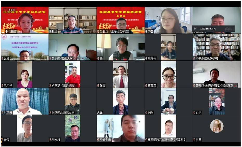 来自西安体育学院、天津体育学院、首都体育学院、沈阳体育学院、成都体育学院、北京体育大学、广州体育学院、南京体育学院、武汉体育学院、哈尔滨体育学院、上海体育学院、西南大学、苏州大学、山东第一医科大学、广西医科大学、广西师范大学等全国东中西部33所成员高校近60位运动康复领域专家及骨干教师参加会议。就现代信息技术构建的虚拟教研室,运动康复专业建设任务与建设思路等话题进行深度探讨和交流。