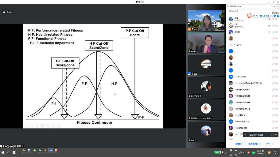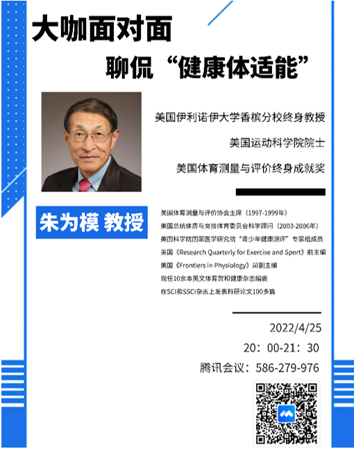 4月25日晚,运动科学学院主办、体适能教学团队承办的国家一流本科课程建设活动——大咖面对面聊侃“健康体适能”活动顺利举行。本次活动有幸邀请到美国伊利诺依大学香槟分校终身教授、美国运动科学院院士、美国体育测量与评价终身成就奖得主——朱为模教授作为主讲嘉宾,有来自上海体育学院、上海师范大学、同济大学、复旦大学、哈尔滨师范大学、哈尔滨体育学院、华侨大学和宁夏大学等十余所院校的五百多名师生参与,活动由上体运科学院庄洁教授主持。