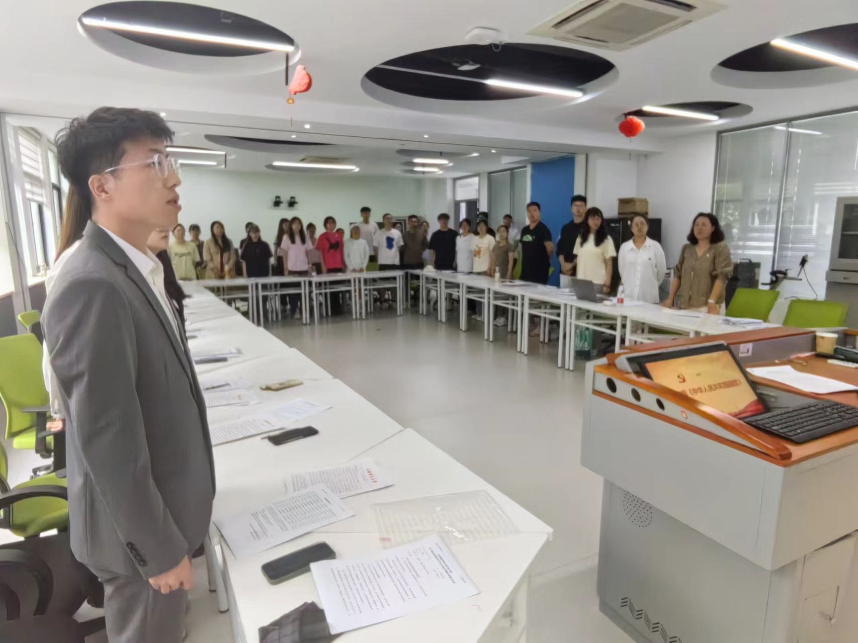 在庄严的宣誓仪式上,党支部书记雷越带领全体党员同志们重温入党誓词。党员们铿锵有力的誓言,充分表达了他们坚定追随信仰之光,将个人命运与国家民族的命运紧密相连的决心和信心,彰显了他们为强国建设、民族复兴伟业勇挑重担、团结奋进的坚强意志。