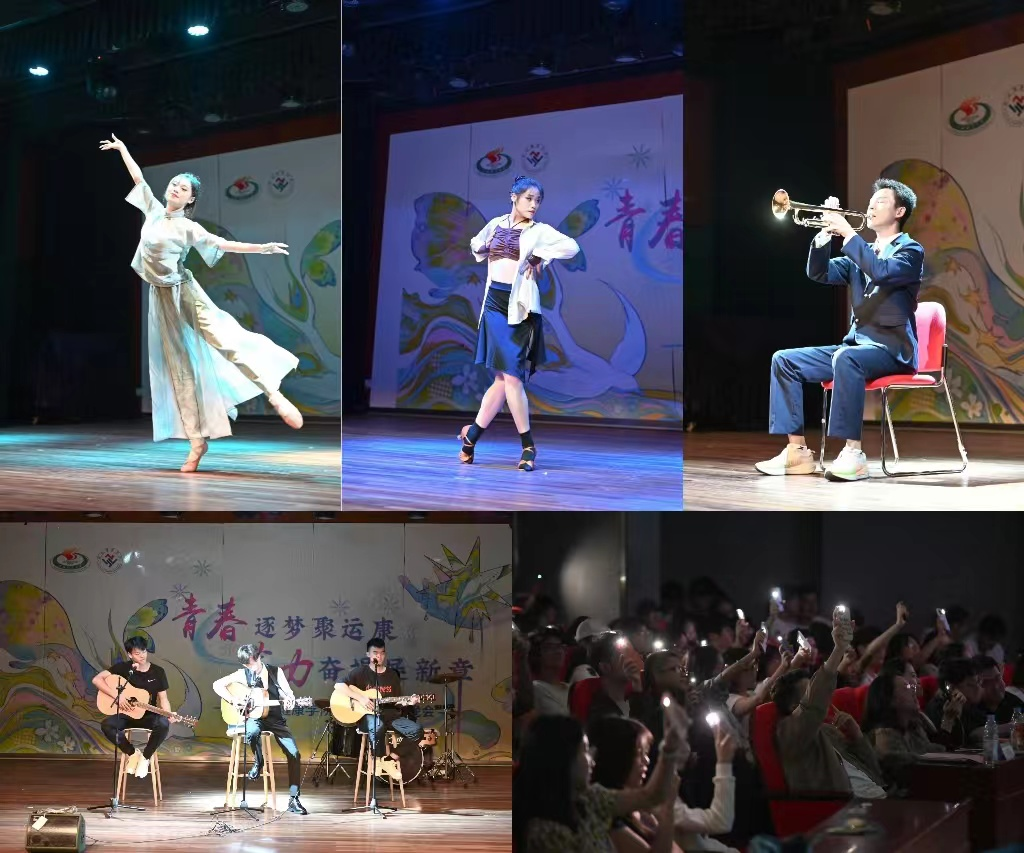 林婉怡同学的《人间烟火》跳出了生活的烟火诗意,李馨怡同学的《Latin girl》则舞出了人生的自在随风,两位同学分别向观众展示了古典舞的柔美与拉丁舞的力量美,“翩若惊鸿,婉若游龙”在此刻具象化;欢呼声浪未平,吴佳昱同学的小号演奏《You raise me up》将全场的气氛推上了高潮;快乐的时光在欢笑声中过得飞快,转眼就来到了最后一个节目《日不落》,张越洋等同学们的弹唱让演职人员们自发相聚在台上随乐鼓掌,晚会在温暖的合唱声中缓缓走到了最后。灯光打在每一个人的脸上,那是幸福又青春的模样。夜色渐深,我们与运康共勉的朝阳就在明天!