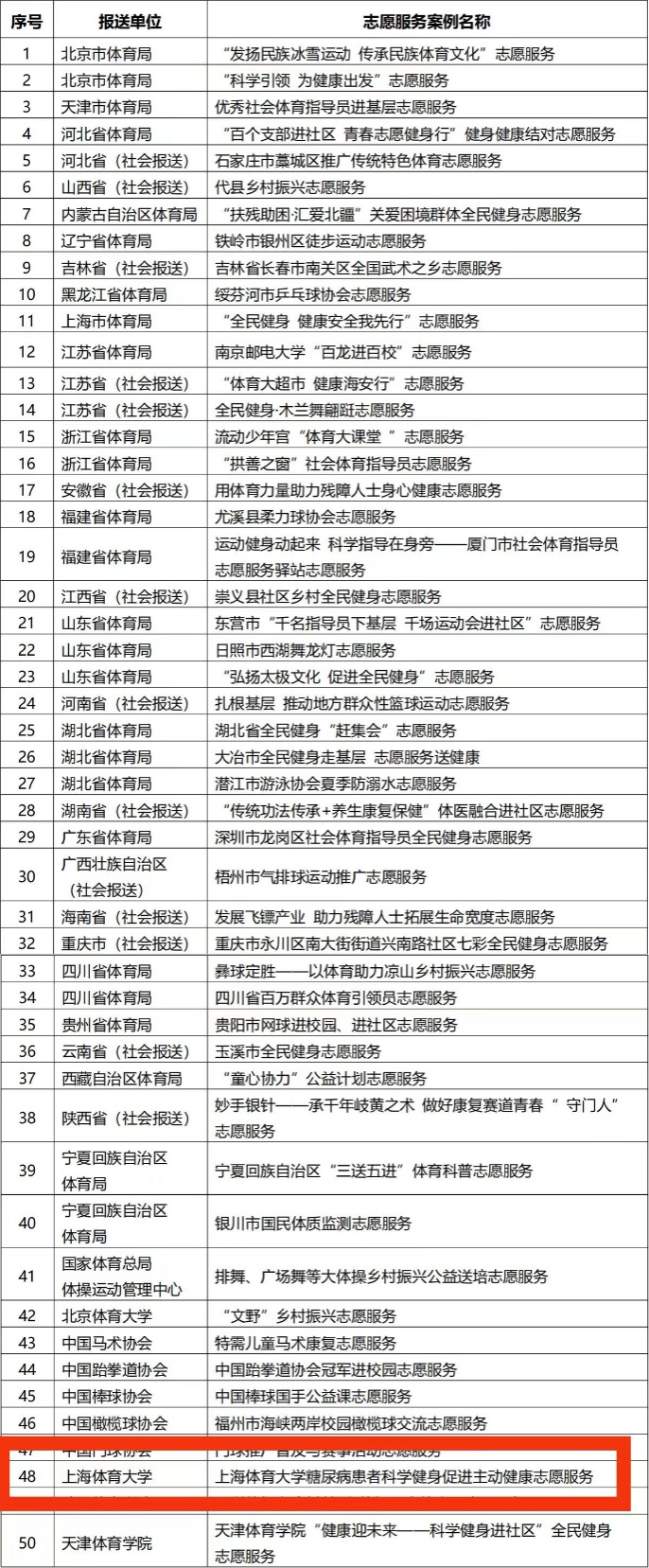 近日,国家体育总局办公厅公布2024年全民健身志愿服务优秀案例评选结果,我校OK138太阳集团刘向云教授团队开展的“糖尿病患者科学健身促进主动健康志愿服务”项目成功入选,成为全国50个扎根基层、服务群众、成效显著的优秀案例之一。