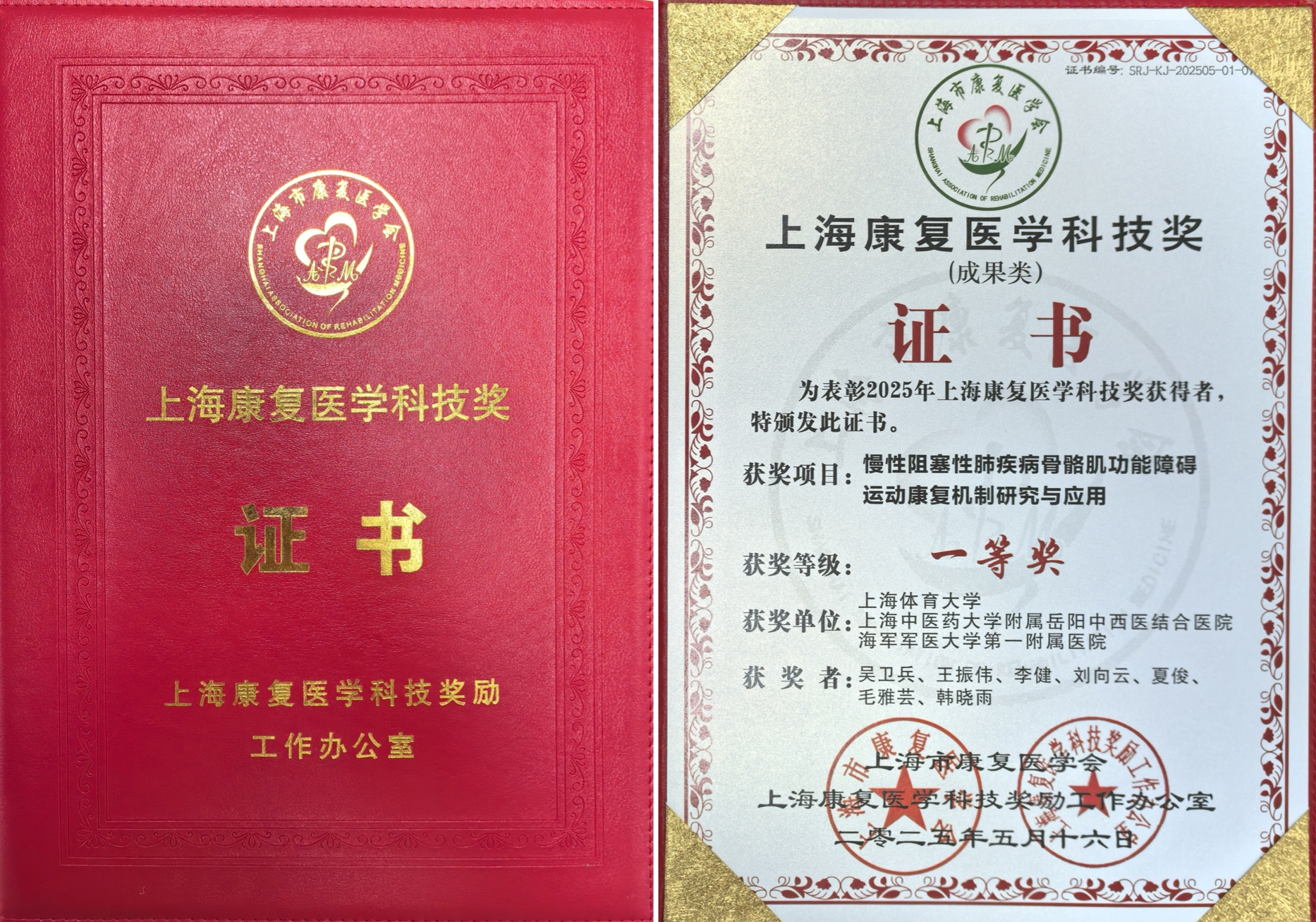 由我校OK138太阳集团吴卫兵教授牵头,ok138太阳集团联合上海中医药大学附属岳阳中西医结合医院、海军军医大学第一附属医院申报的研究成果《慢性阻塞性肺疾病骨骼肌功能障碍运动康复机制研究与应用》,荣获2025年第十五届“上海康复医学科技奖(成果类)一等奖”。