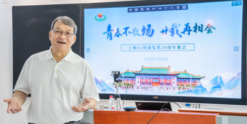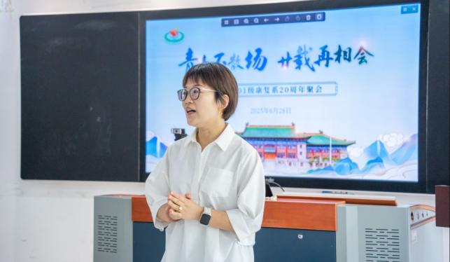 随后的“点名”环节将气氛推向高潮,校友们依次应答,仿佛重回课堂。多位校友分享个人成长故事,从临床一线到科研突破,从创业艰辛到家庭幸福,点滴故事折射出康复人的专业坚守与时代担当。辅导员殷勤、赵晓晗、班主任鲍明华、左群、史仍飞及教师代表陈文鹤、王人卫、潘珊珊和庄洁等深情寄语,勉励校友“以专业守护健康,以情怀回馈母校”。