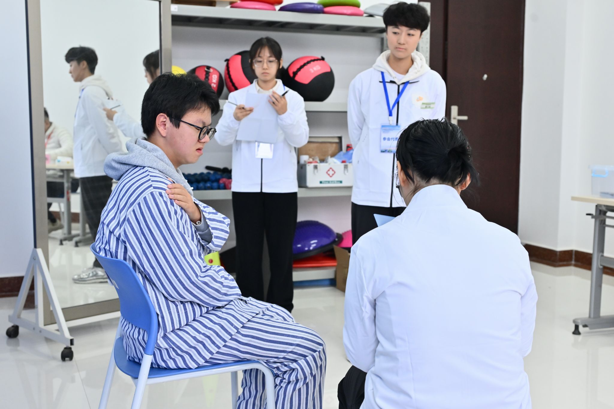 运动健康学院领导班子高度重视此次高规格赛事,赛前精心组织、周密部署,成立由多位骨干教师组成的指导团队,开展系统化、实战化、全流程备赛训练。参赛学生在暑期即投入备赛,近三个月持续强化虚拟仿真、病例分析、功能评估、肌骨康复、慢病康复及运动防护等核心技能。在赛前两周更是进入高强度冲刺模式,反复推演流程、精细化打磨操作,以最佳状态迎接比赛挑战。