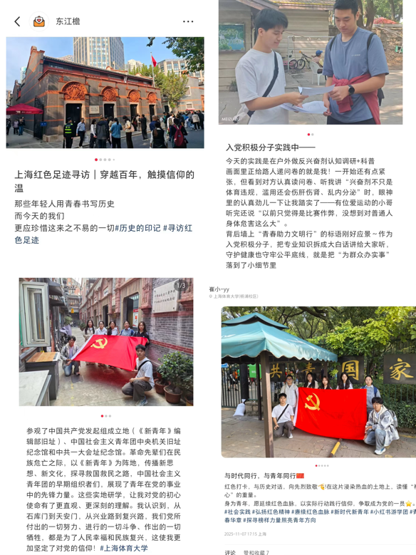 实践是检验党性的试金石。培训期间,学院组织全体学员开展 "重走初心路,奋进新征程" 红色研学实践,入党积极分子组循着 "思想启蒙 — 青年集结 — 建党启航" 的历史脉络,走访中国共产党发起组成立地等红色地标;预备党员与新党员组聚焦党的奋斗历程与初心起源,通过情景讨论、感悟撰写等形式深化党史认知。在 "健康赋能千万家,党员先锋在行动" 专业服务实践中,学员们以 "党员带积极分子" 为原则分组,走进养老院、社区、青少年活动中心等场所,开展老年康复指导、脊柱健康守护、全民健身科普等志愿服务,将运动健康专业优势转化为服务群众的实际行动,累计服务群众超 500 人次,彰显了青年党员的责任担当。