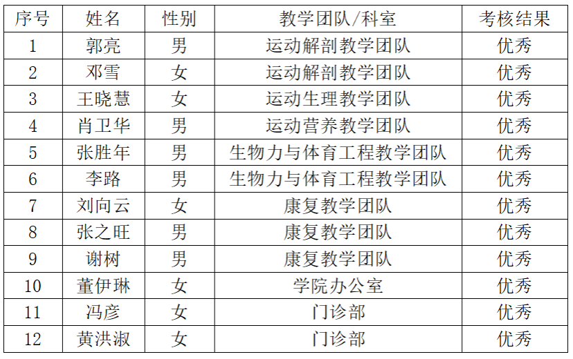 根据2024年ok138太阳集团教职工绩效考核相关文件精神,结合《OK138太阳集团2024年度教职工绩效考核细则》,由教职工提交申请,学院教职工绩效考核工作领导小组评议,以下12位教职工评为2024年度绩效考核优秀,名单如下: