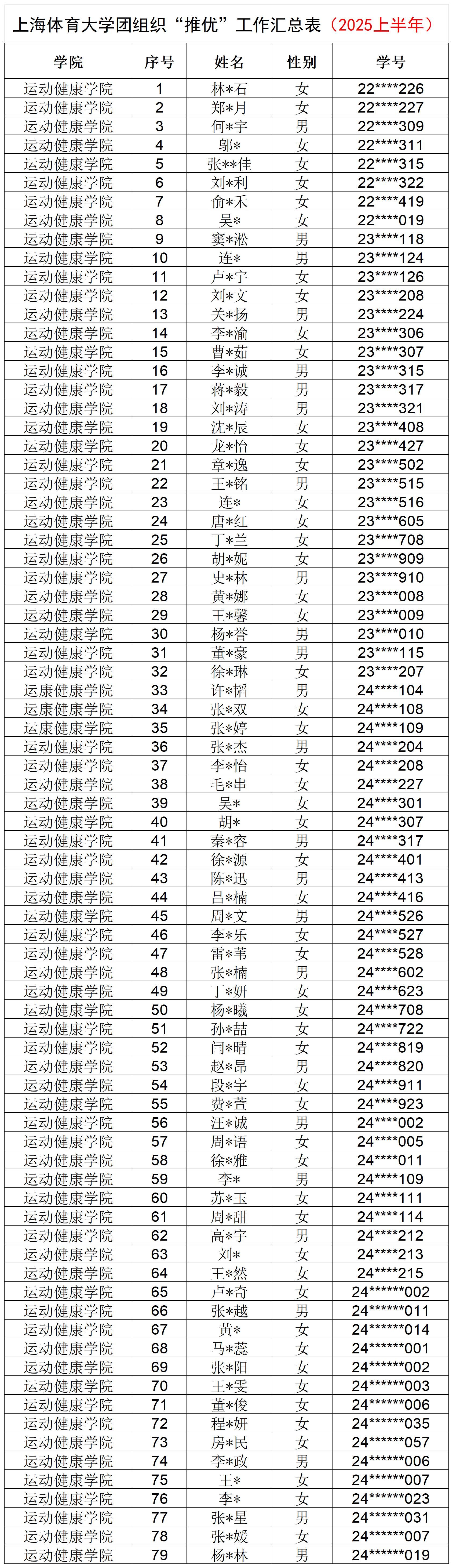OK138太阳集团团委根据ok138太阳集团团委《关于做好2025年上半年推荐优秀共青团员作入党积极分子工作的通知》(上体团〔2025〕6号)、《ok138太阳集团“推荐优秀团员作入党积极分子人选”工作实施细则》的文件要求,在广大团员群体中积极开展推荐优秀团员作入党积极分子人选工作。经各团支部评议推荐、学院团委委员会审核,认为以下同志符合推荐条件,现将推优名单公示如下: