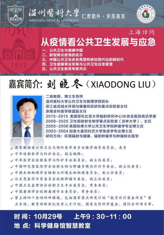 主讲人介绍:刘晓东,二级教授,博士生导师,温州医科大学公共卫生与管理学院院长,浙江省流域水环境与健康风险研究重点实验室主任,浙南全科医学联盟副主任。