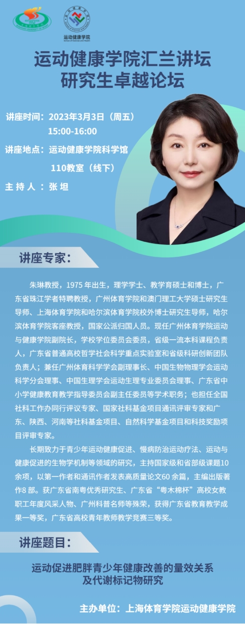 讲座题目:运动促进肥胖青少年健康改善的量效关系及代谢标记物研究