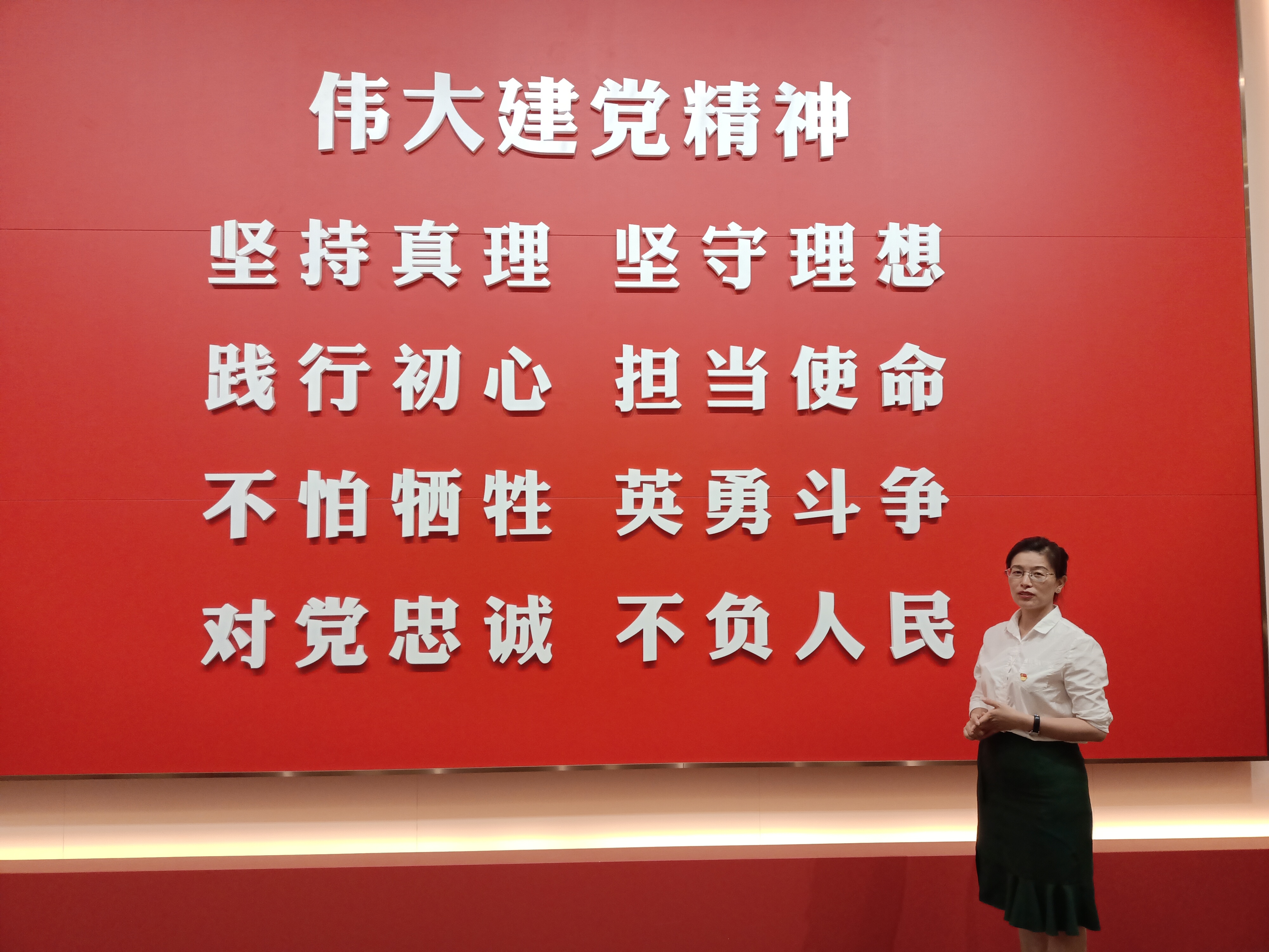 党委书记熊静在“伟大建党精神”的巨幅展板前,为在场教师党员上了一堂生动的专题党课,熊书记首先就此次参观向在场所有党员分享了她的参观感受,并就学习习近平总书记“在建党100周年庆祝大会上的讲话”中提出的“伟大建党精神”进行了解读,她指出,一百年的岁月里,我们党从一个只有50名党员的“星星之火”终成“燎原之势”,一跃成为了一个引领14亿人民泱泱大国的执政党,习近平总书记“人民就是江山,江山就是人民”的伟大论断就是答案,我们的党始终高举马克思主义旗帜,坚持人民是历史创造者的马克思主义唯物史观立场,将人民的利益,民族的复兴放在首位,全心全意为人民服务,始终保持着自身的先进性,方能百年中勇立潮头领航指路,这百年历史现实而又深刻地回答了马克思主义为什么行,中国特色社会主义为什么好,中国共产党为什么能的历史之问。熊静书记对在场教师党员说道,三尺讲台是我们的为党育人,为国育才的阵地,作为党员我们必须守土有责,坚持社会主义办学方向,坚持立德树人本位,就是要将这百年党史深学吃透,要将党员的初心和使命贯彻在教育教学的全过程中,在“三全育人”的过程中,以对党的事业负责的高度政治责任感和对中华民族伟大复兴负责的高度历史使命感守好三尺讲台,传道受业解惑。亲身感受从“石库门到天安门”的伟大历史进程后,熊静书记亲切生动的党课内容引起了在场教师党员的广泛共鸣,纷纷表示将践行初心使命,学习贯彻“伟大建党精神”,立足三尺讲台奉献自己的力量。