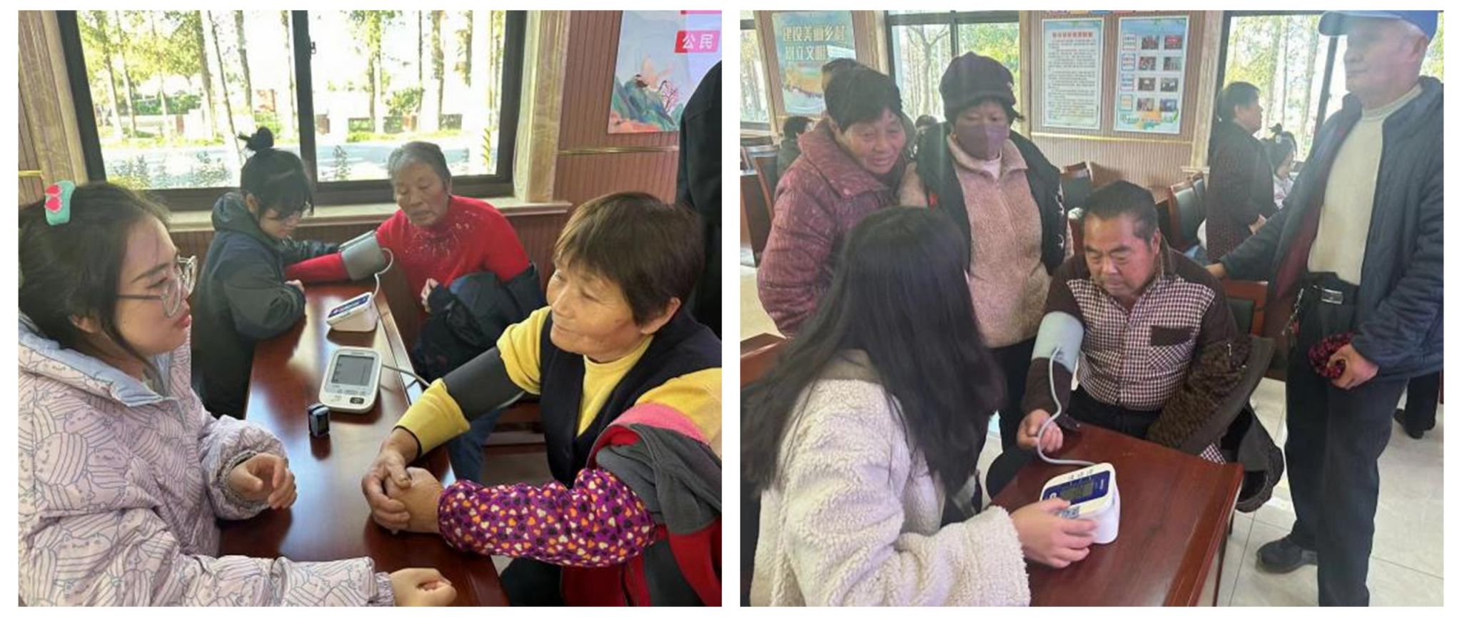 随后,两位党员赵桂玲和邹旭运用学院提供的血压计和血氧检测机,为村民们检测血压和血氧情况,并根据数值情况细心询问村民们平时的身体健康状况、饮食和运动习惯等,并给出相应的建议,给予大家针对性的关怀。此次义诊咨询环节,让村民们了解到了自己身体的健康状况,并了解到如何针对性的改善生活习惯、提高身体的健康水平。