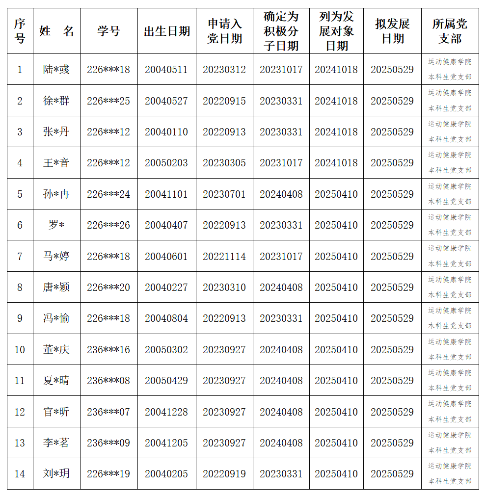 以上发展对象经过党组织的培养、教育和考察,基本符合党员条件。经党支部研究,准备发展为中共预备党员,特此公示。公示时间为七天(2025年5月16日—2025年5月22日),各单位或个人如有意见,可通过来电、来访、来函等形式反映。