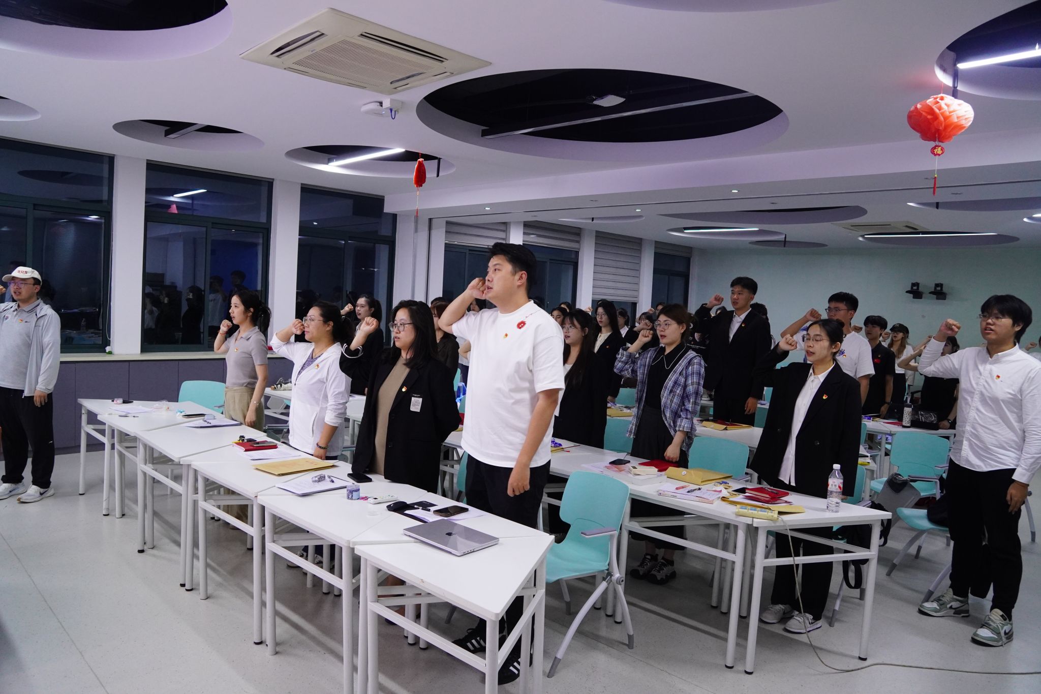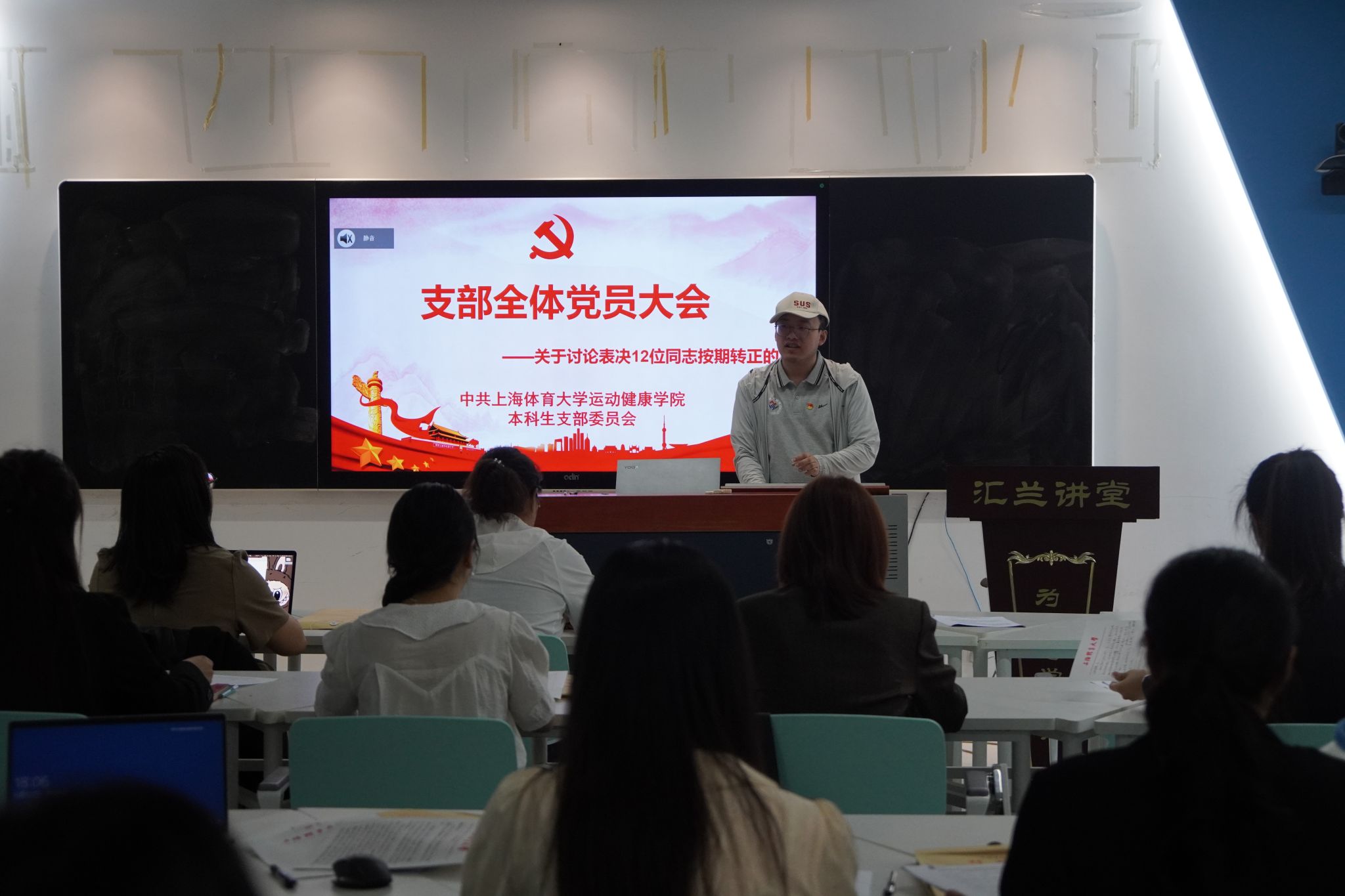 转正大会在庄严的国歌声中拉开帷幕。在会上,12位预备党员围绕各自在预备期内的思想动态、学习成果、实践经历等表现情况进行了全面汇报并详细介绍了自己在未来毕业方向上的个人规划也郑重表达了按期转为正式党员的强烈愿望和坚定决心。