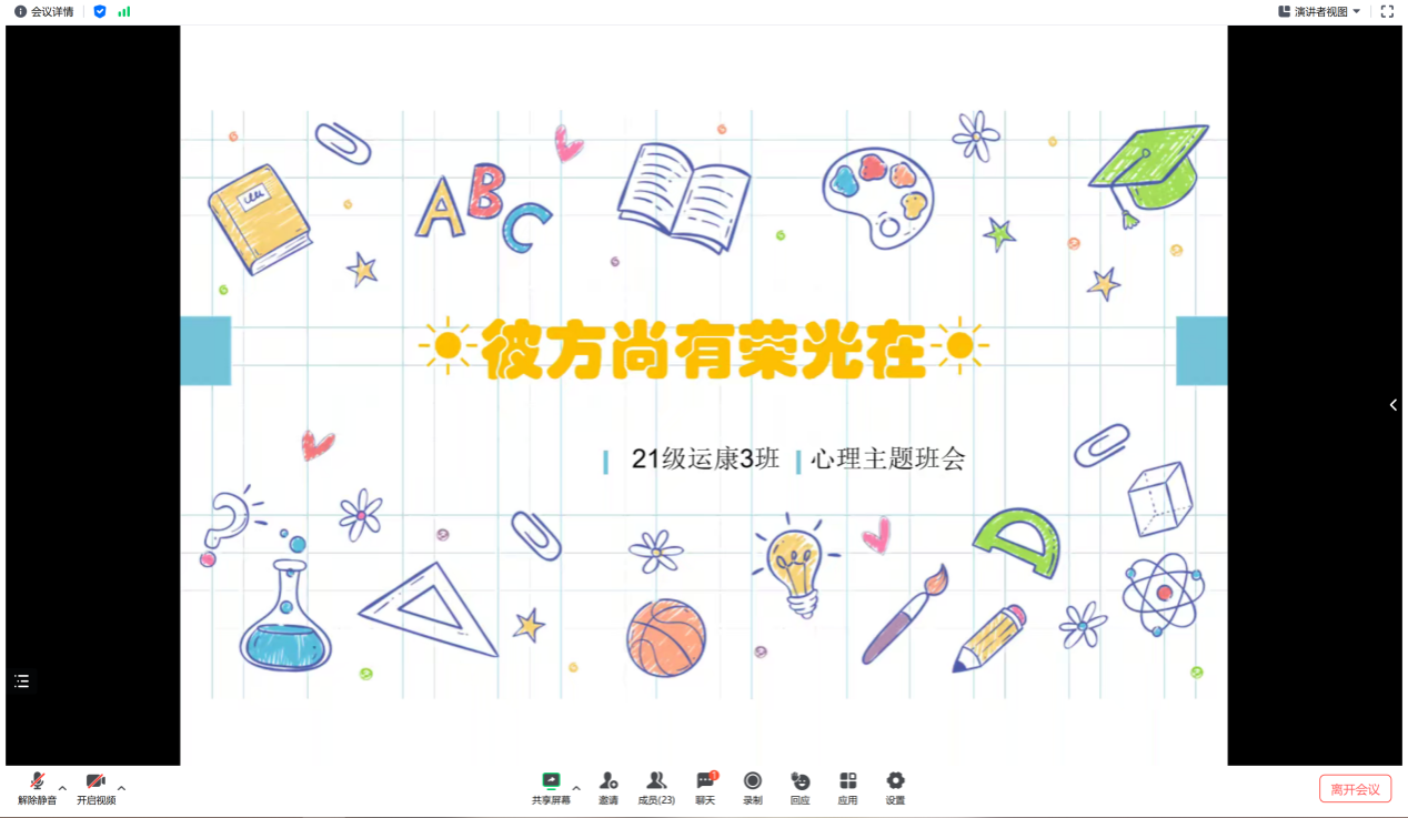 正处于大三阶段的同学们,面临着各种压力的困扰,而长期受到压力困扰会使同学们产生许多不良情绪。6月6日晚,OK138太阳集团21级运动康复3班以腾讯会议的形式开展了以“彼方尚有荣光在”为主题的线上心理主题班会。旨在帮助同学们找到缓解压力的方法,同时在面对未知的挑战时充满信念和动力,与压力和解、与压力共舞,相信未来美好生活的曙光就在前方。