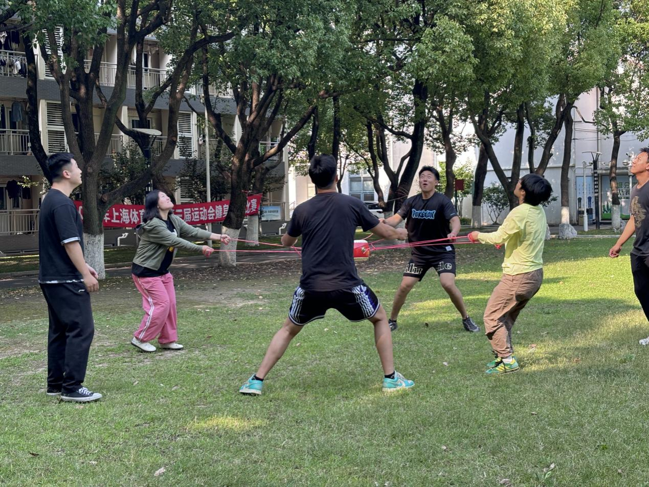 第一项团队游戏“同心击鼓”,要求每位组员协同控制鼓面,在2分钟内尽可能多地连续颠起皮球。看似简单的游戏,却需要高度的团队节奏一致性与即时沟通协调。活动过程中,同学们在短暂练习中迅速进入状态,或策略调整,或击掌鼓劲,在欢呼与笑声中一次次刷新团队记录。这不仅是节奏的比拼,更是心灵的同步。