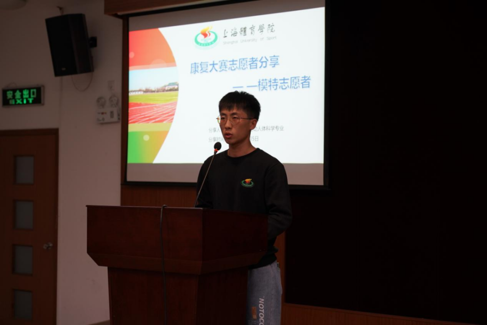 郭绍瑜同学在此次大赛期间担任模特志愿者。他表示做模特志愿者期间也是一个学习的过程,在观摩和配合选手比赛的过程中,他也能对知识进行巩固与积累。同时,他还在志愿服务中更加深刻的认识了本次大赛的主题:“体医融合,健康中国”。他提到我们相关专业的同学应该要有主人翁意识,积极参与相关领域的活动。本次志愿者经历也让他积累了实践经验,学习到了丰富的运动康复知识。最后,郭绍瑜同学呼吁同学们多参与学校志愿活动,收获实践财富。