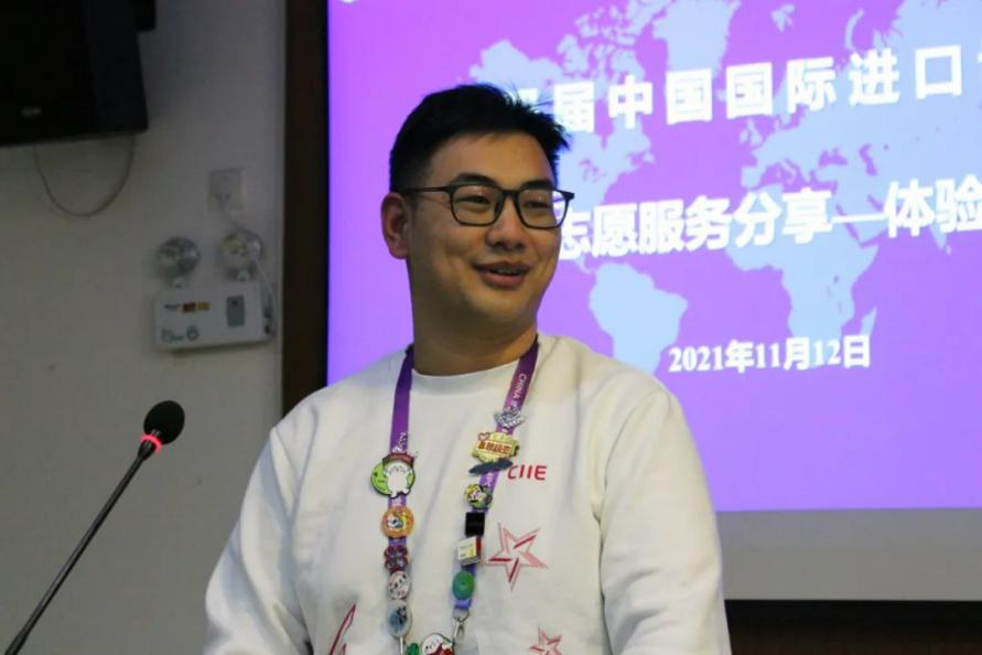 在分享中,李想同学提到一级体验官就像是显示器,能用镜头让更多的人全面地认识进博会以及记录小叶子们志愿生活的点滴。作为大三的学生,因学业上的压力,让他在参与之前有纠结与忐忑,但是当他来到进博会之后,他就不后悔做出了担任进博会志愿者的决定。另外,李想同学与其他院校的同学们交换的徽章见证了志愿服务期间的友谊,他也将他换到的徽章们带到了现场和大家展示分享。通过参与进博会志愿服务,李想同学深刻表达了对祖国强大力量的惊艳,表示同学们应投身学业,为社会带来新思想、新力量。最后,他分享了几张花絮照片,为我们展现了小叶子们充实且快乐的志愿经历。