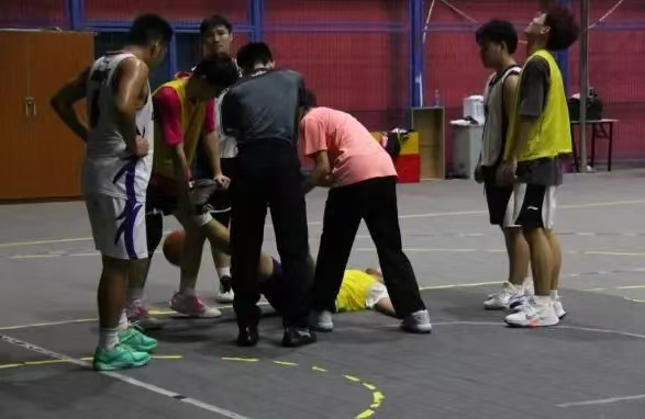 随着裁判一声哨响,半决赛正式开始,对战双方分别是医技8班和医技7班。由白队(8班)发球,黄队(7班)开场后便迅速进入状态,采用全场贴防,断下球权后一记突破上篮拿下首分,随后战术犯规试图打乱8班的进攻节奏,但8班球员顶住压力,先是韩凯同利用个人能力杀入内线上篮得分,随后积极防守断球后交给6号球员,他毫不手软,一记抛投拉开比分,黄队不甘示弱,李金臣持球背打韩凯同,用出科比招牌后仰跳投,篮球空心入网,精彩的answer ball!白队七号拉到外线后强硬突破打进1+1,加罚稳稳命中。在数次球权转换后,黄队在三秒区内犯规,白队6号罚球得分继续扩大优势。黄队球员多次尝试三分出手但运气欠佳,球均弹框而出。随着时间的流逝,双方球员体能消耗明显,在一次篮板争抢中出现了意外状况,黄队球员落地后崴脚同时小腿抽筋,场边人员立刻对其情况采取紧急措施,将其搀扶下场。在确定球员伤势后裁判示意换人,随后比赛继续进行,白队6号球员面对黄队队员突破奉献精彩盖帽,同时再次拿下球权上篮得分。黄队见势放缓了进攻节奏造犯规,罚球空心命中。韩凯同三分出手不中,但6号队员补篮得手。黄队李金臣接队友传球,漂亮的炸球转身过掉两人打进全场比赛最后一球。之后的时间里双方均无建树,最终8班以11-5的比分昂首挺进总决赛,5班队员们也向大家诠释了不抛不弃,奋斗到底的体育精神。