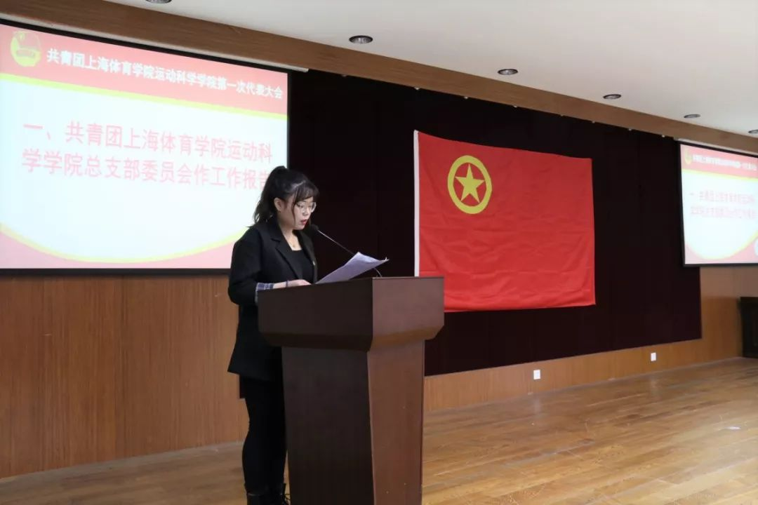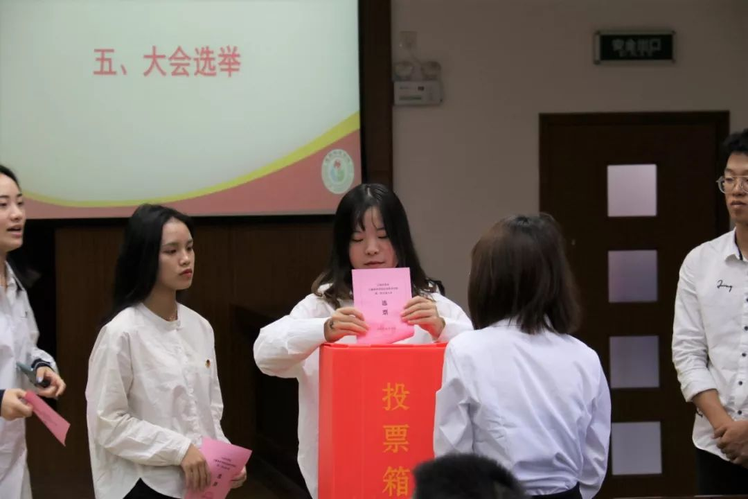 在团总支委员陈懿同学宣读共青团上海体育学院运动科学学院总支部委员会工作报告(审议稿)后,第一届分团委委员选举开始。总监票人与监票人向代表们展示了投票箱。在监票人员的监督下,代表们依次上台将手中的选票投入票箱。