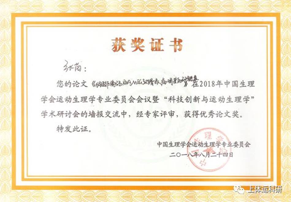 2016年,张苗怀着对运动人体科学专业的浓厚兴趣和对上体的向往,本科学习结束后参加了上海体育学院的硕士研究生招生考试,并成功录取。研究生期间,她以第一作者身份在《生理学报》等期刊发表3篇论文,并参与发表多篇SCI及核心论文。此外,她多次参加相关领域的学术会议,以口头汇报或书面交流的形式分享自己的科研成果,并在多次会议中获得“优秀论文”荣誉奖项。