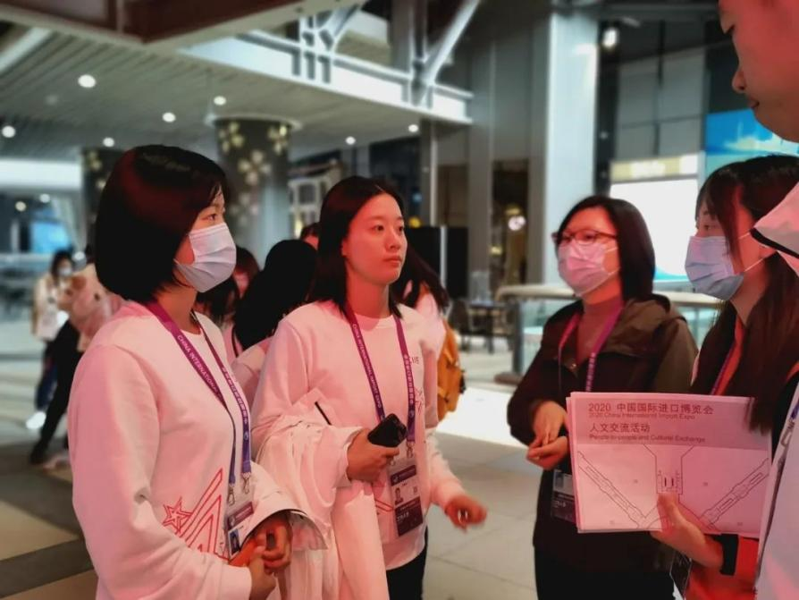 在本次进博会中,运科小叶子们主要负责人文交流活动展示区域的志愿工作,他们的主要的职责是为观展游客提供引导与咨询帮助、反馈展商的问题与需求、提供线下线上的收单保障。