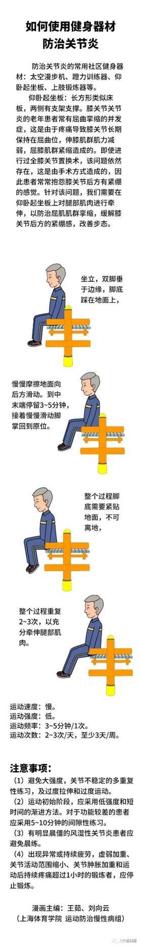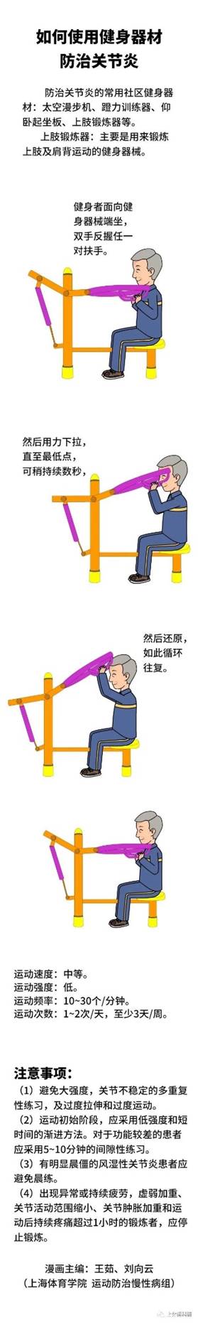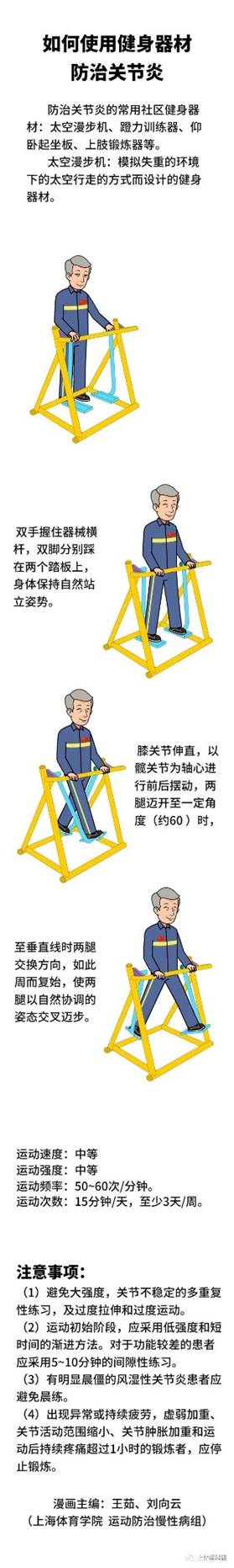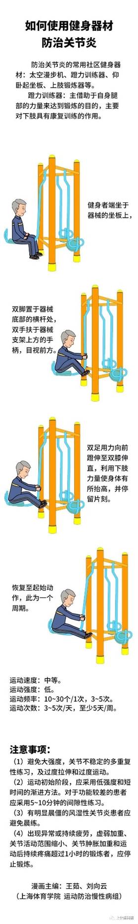 如何使用健身器材防治关节炎:使用健身器材防治骨关节炎时,要选择在晴朗温暖干燥的环境天气下进行,注意对关节的保暖,避免风吹。以下主要针对最常见的膝关节炎来讲解如何运用健身器材进行防治。