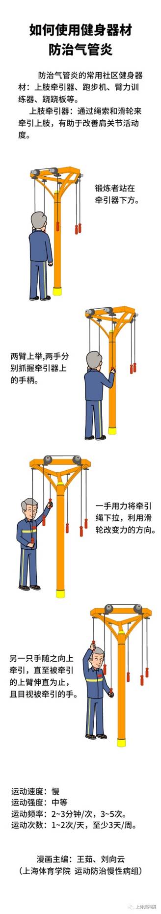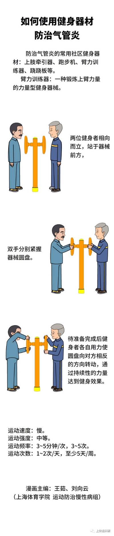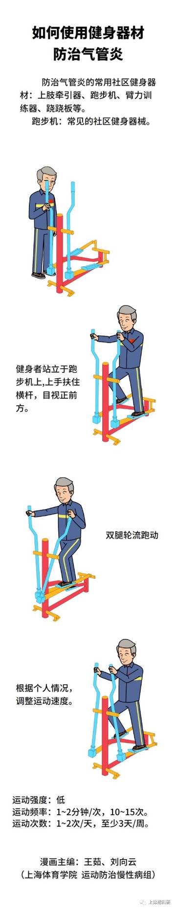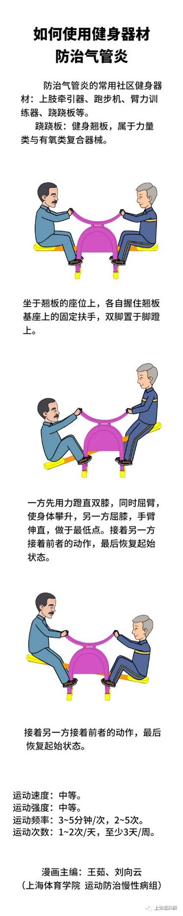 防治气管炎的常用社区健身器材:上肢牵引器、跑步机、臂力训练器、跷跷板等。