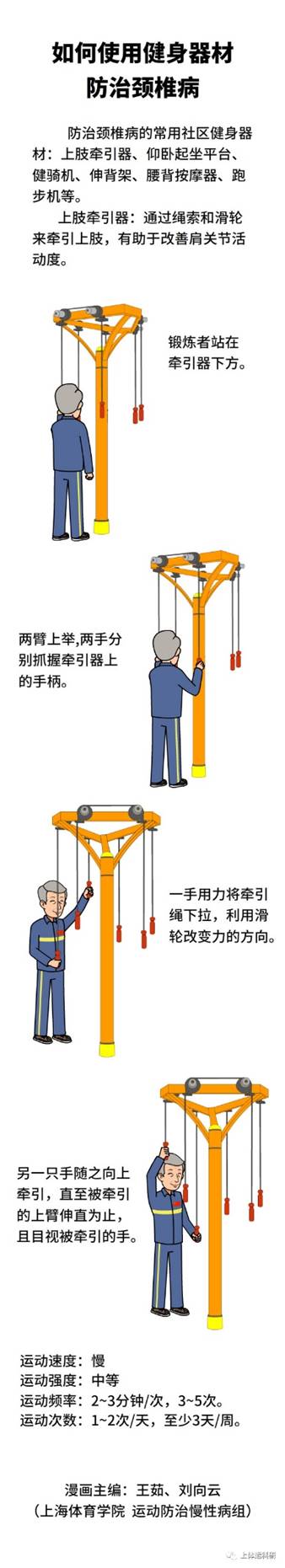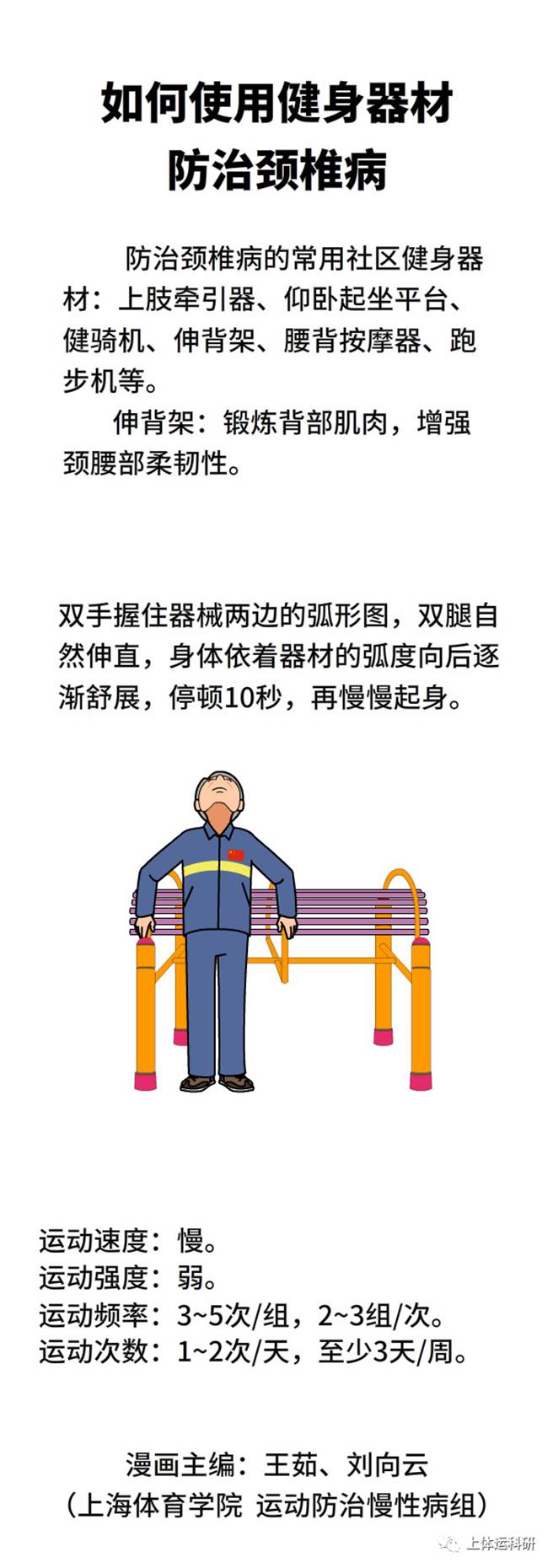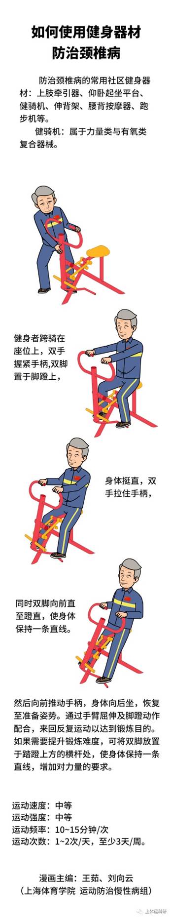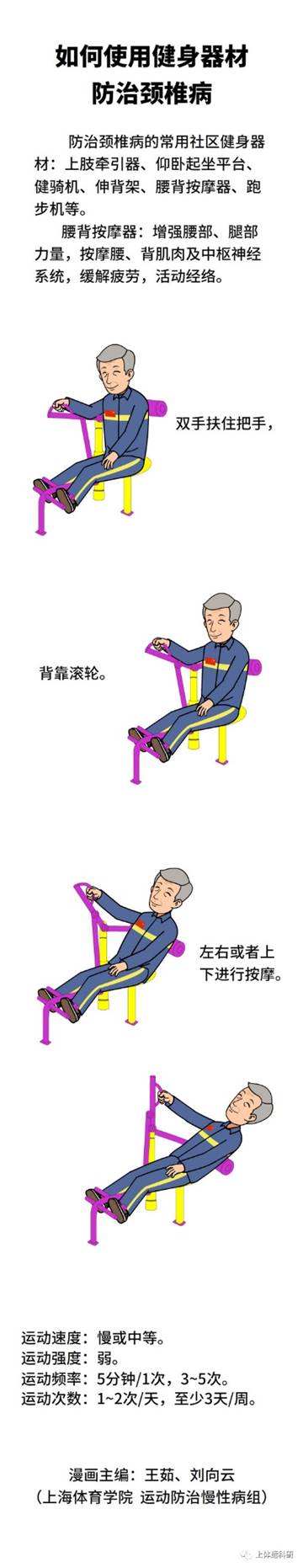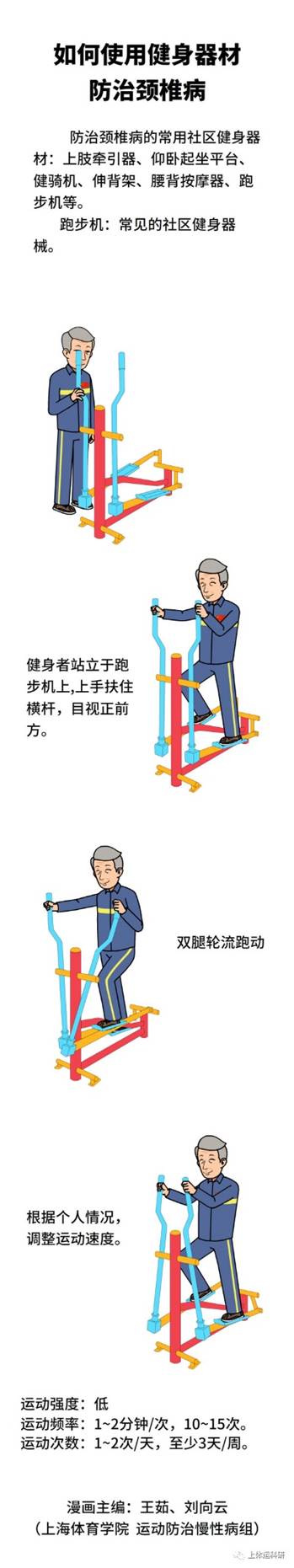 防治颈椎病的常用社区健身器材:伸背架、腰背按摩器、仰卧起坐板、上肢牵引器、跑步机、健骑机等。