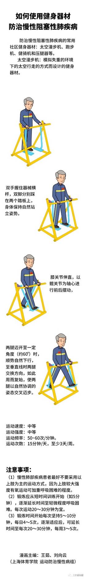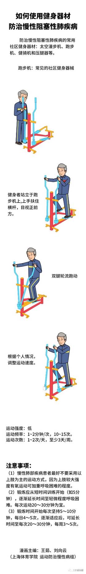 防治慢阻肺的常用社区健身器材:太空漫步机、跑步机、健骑机和压腿器等。